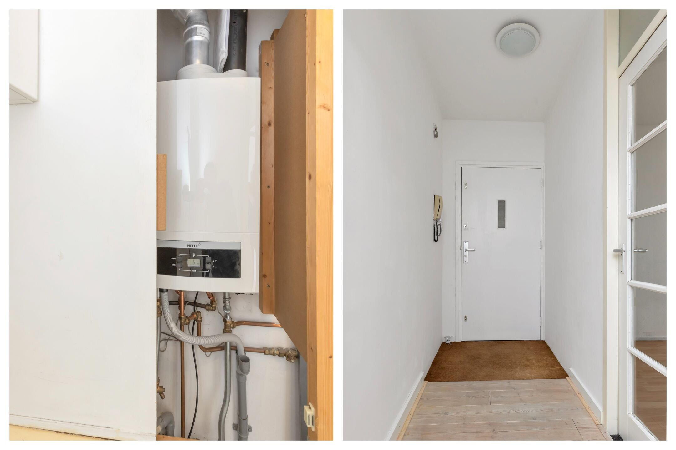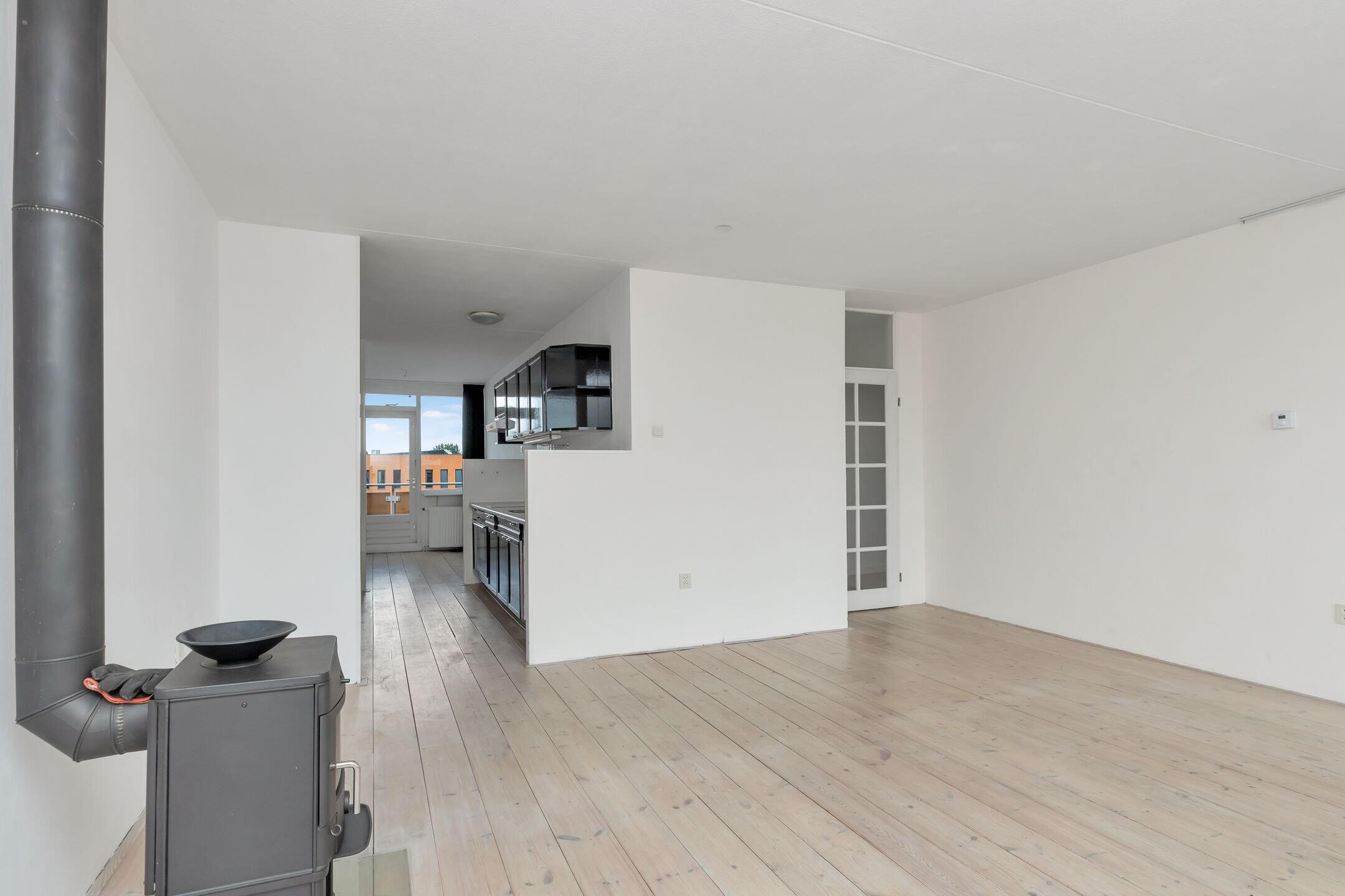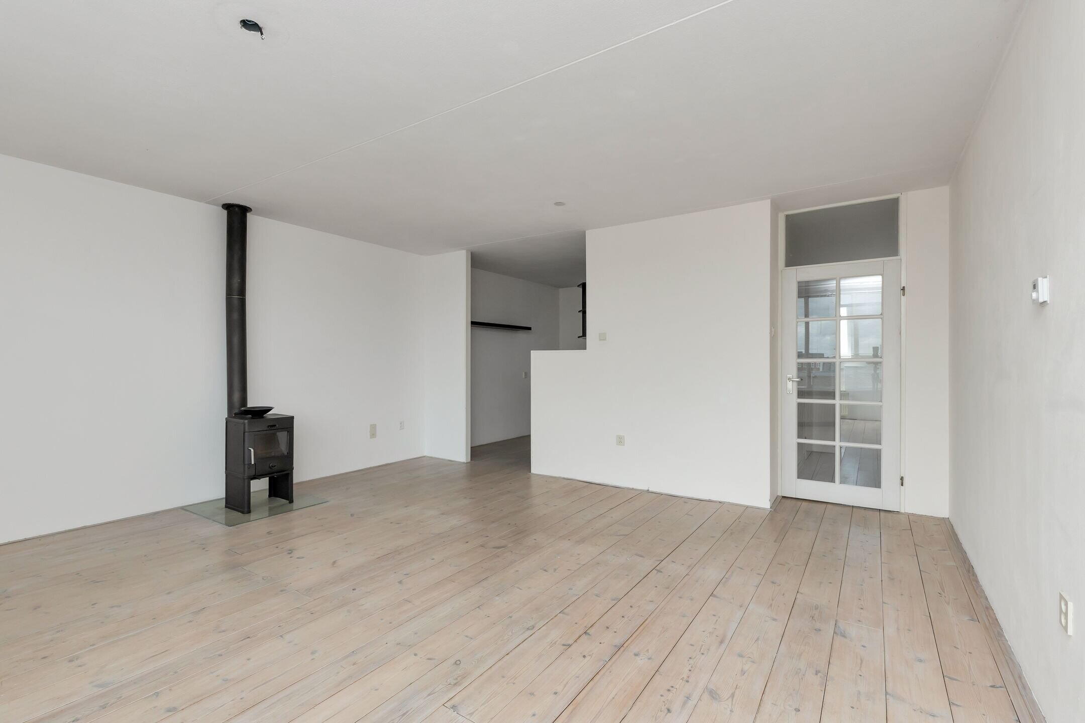 Hal met garderobe, links een slaapkamer met laminaatvloer en toegang tot balkon, gang naar de badkamer, welke voorzien is van een douchehoek en wastafel, separaat toilet met fonteintje, slaapkamers 2 en 3, meterkast, wasruimte met cv-installatie (Vaillant uit 2022) met wasmachine- en drogeraansluiting. Doorgang naar de woonkamer met gezellige houtkachel en met dubbele deuren naar het balkon, keuken met keramische kookplaat, afzuigkap en oven, eetgedeelte met doorgang naar het 2e balkon.