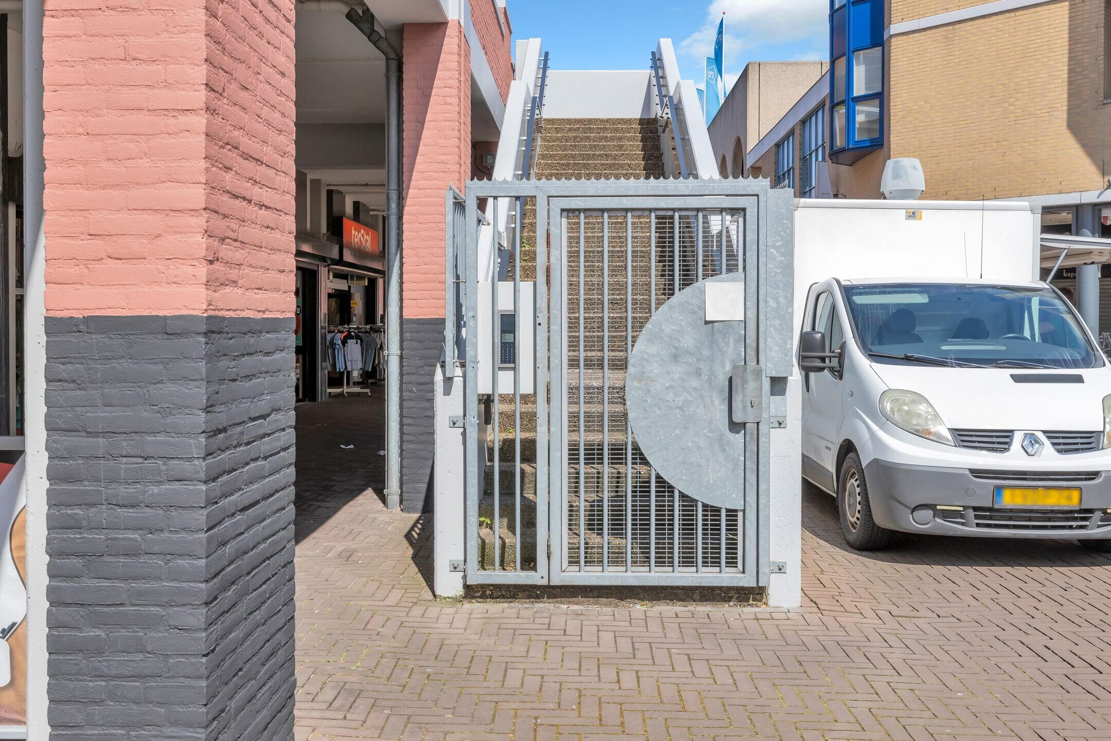 Bellentableau met afgesloten trapopgang en brievenbussen.